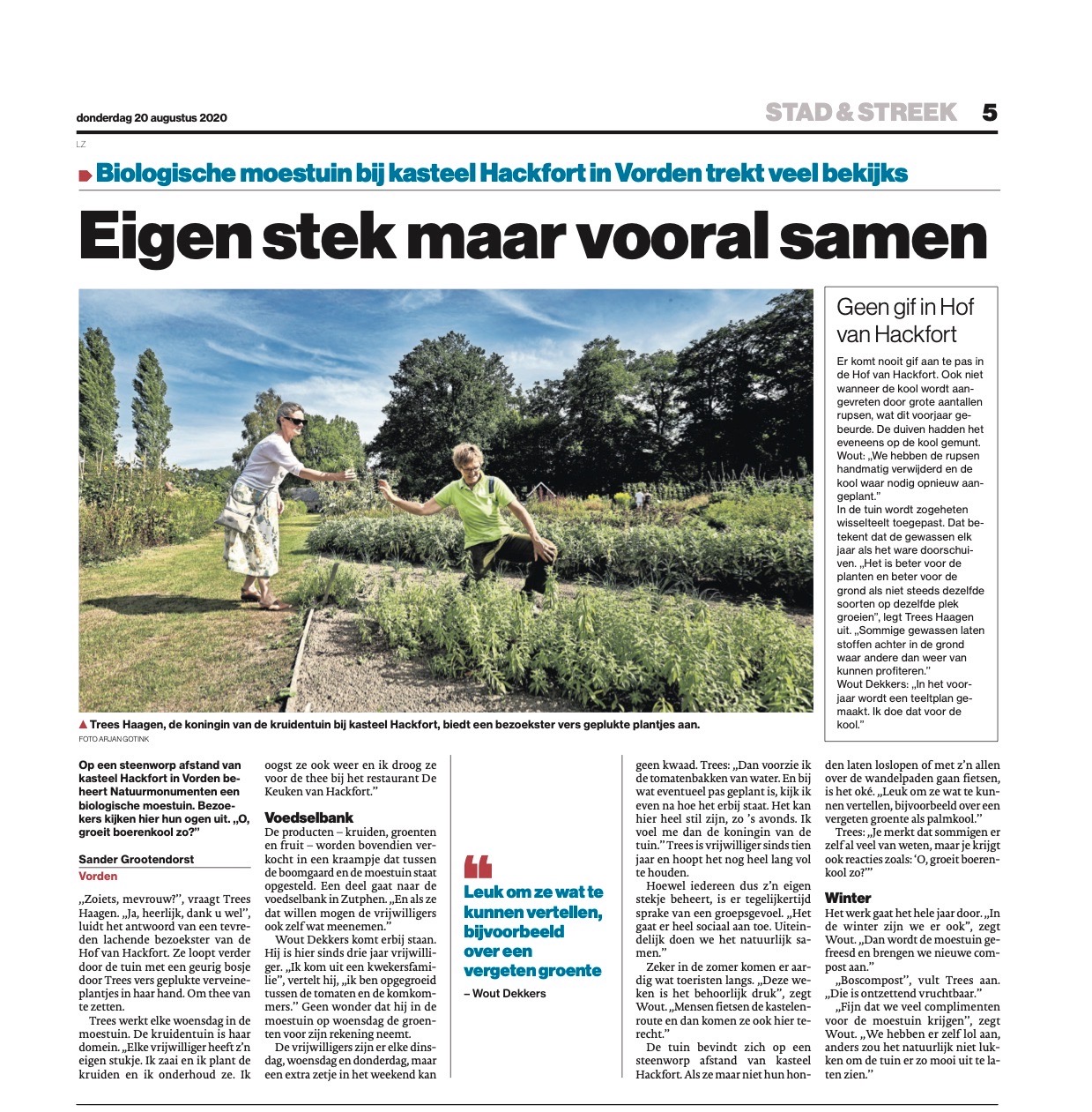 Langs de Bockhorsterstraat, in het buitengebied tussen Olst en Deventer, zagen ze het bordje bij de theetuin van Herma Schmutzler. Ze nemen plaats, drinken een kopje koffie, eten een plakje cake en wandelen ‘het paradijs’ in. ,,Wat een prachtige bloemen, geweldig!”